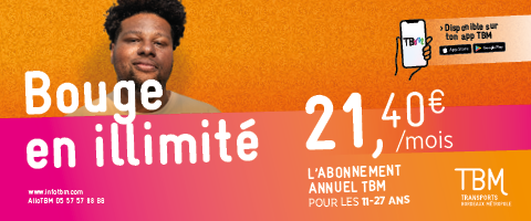 Pour plus de civisme : évitez-les tous ! Jusqu'au 6 décembre : expérimentation lors d'interruptions tram Tournée de rentrée TBM : venez voir nos conseillers ! Rendez-vous chez vous : retrouvez nos conseillers dans votre commune ! Découvrez les nouveautés de septembre Fermeture de votre Parc-Relais Mérignac-Arlac 50 livres à découvrir chaque mois sur Premier Chapitre Toute la CARTE JEUNE dans une seule appli ! Inscrivez-vous au Panel TBM et améliorez le réseau TBM avec nous ! Cinémas (CGR et Mégarama)