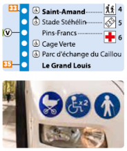 - Les arrêts identifiés comme « accessible/praticable » garantissent aux utilisateurs en fauteuil roulant (UFR) une hauteur de trottoir et un espace suffisant pour manoeuvrer, monter et descendre du bus à l’aide de la palette.