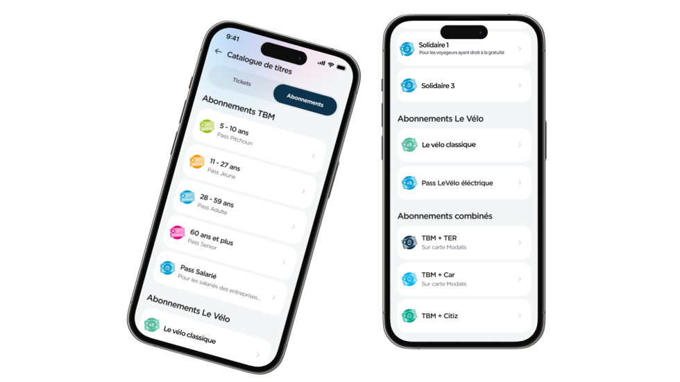 Rendez-vous sur le menu "Titres" de votre nouvelle app TBM puis cliquez sur le bouton "Acheter un titre" vous retrouverez ainsi deux rubriques "Tickets" et la rubrique "Abonnements".